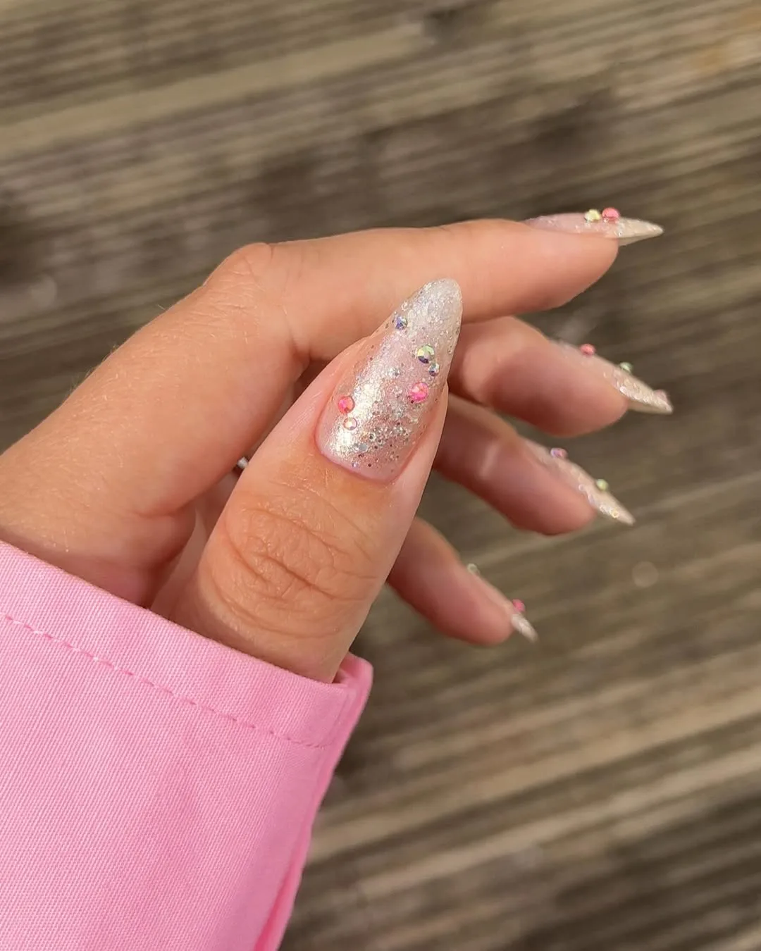 This romantic April design features an elongated almond shape with a sheer, high-shine iridescent glitter base, elevated by a bold twist of scattered magenta and silver micro-studs for a sophisticated, garden-inspired shimmer.