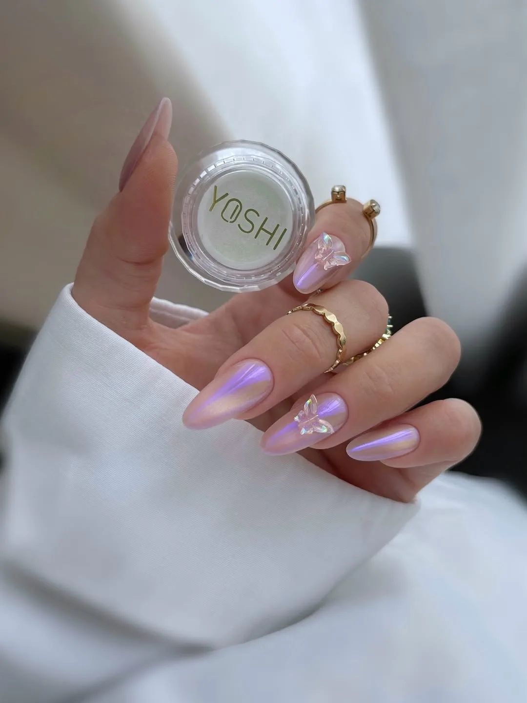 This ethereal April look features a soft lavender-pink base on a graceful almond shape, finished with a high-shine aurora chrome and accented by delicate 3D iridescent butterfly charms for a whimsical, high-fashion glow.