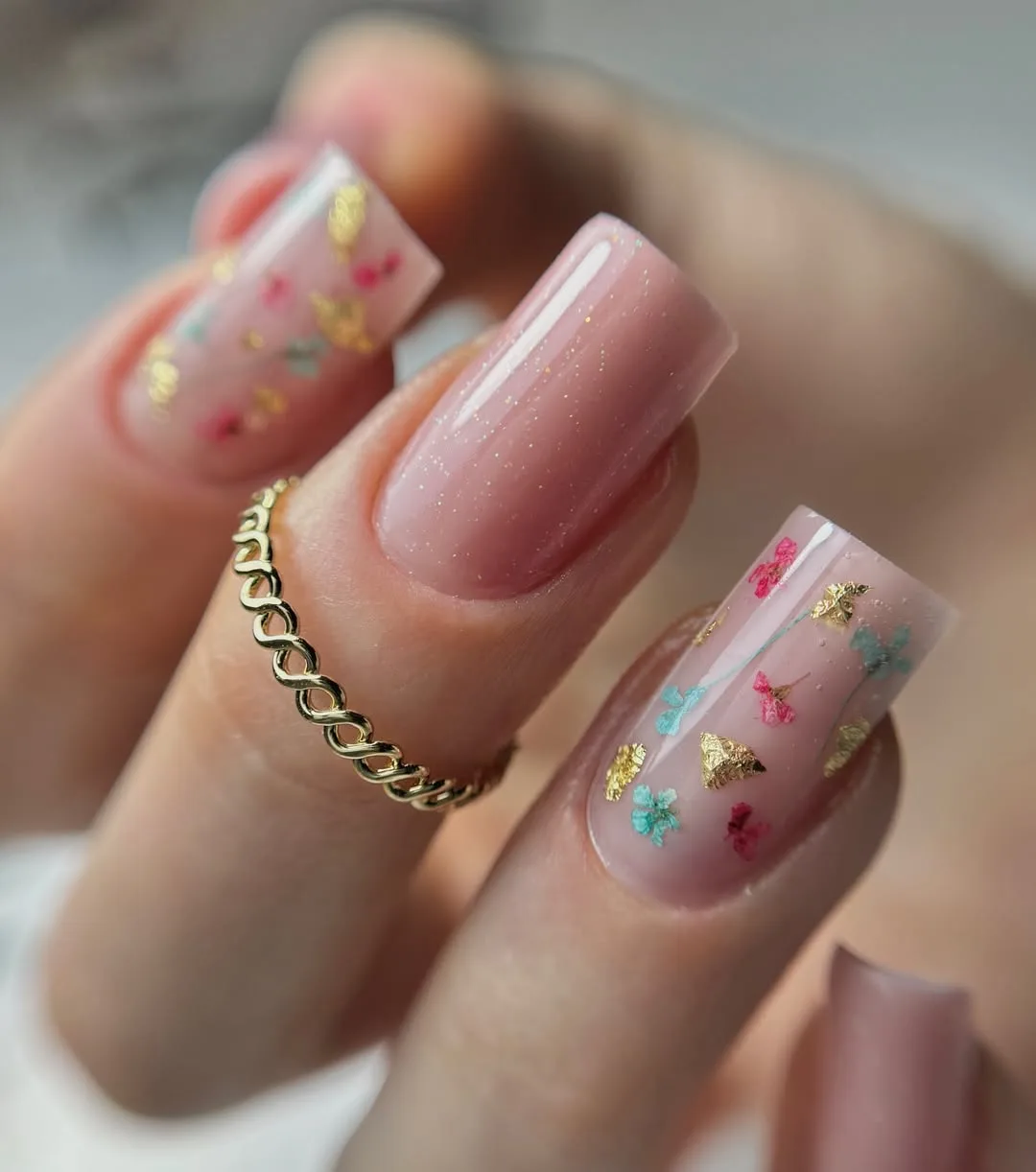 This romantic April design showcases a soft, shimmering sheer rose base on a clean square shape, featuring encapsulated dried wildflowers and delicate gold leaf flakes for a sophisticated, nature-inspired “milk bath” aesthetic.