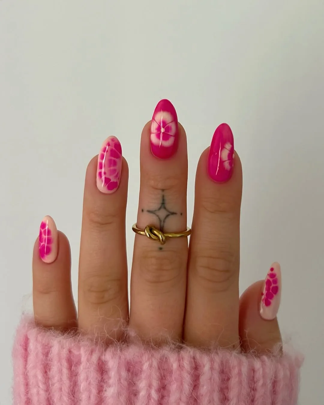 This romantic April design features a striking contrast between a soft pale pink base and a bold magenta bloom, utilizing a blooming gel technique on a graceful almond shape to create a soft, ethereal floral effect that feels both modern and whimsical.