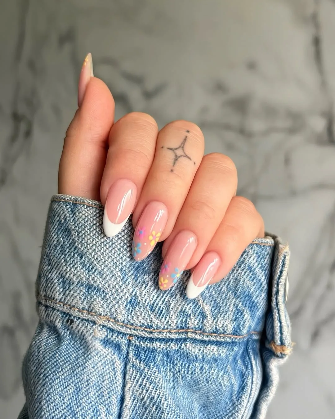 This chic April design reimagines the classic French manicure on a graceful almond shape, pairing crisp white tips with playful, hand-painted pastel daisies in soft blue, yellow, and lavender for a romantic and elevated spring aesthetic.