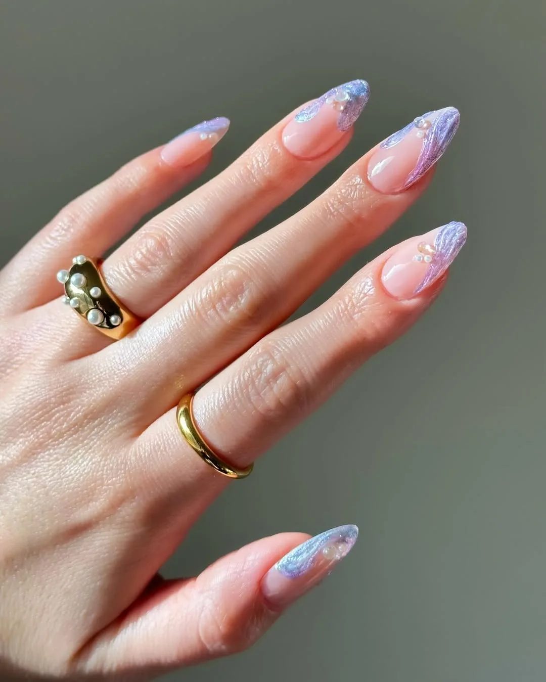 This romantic April design features a sheer nude base on a graceful almond shape, elevated by ethereal periwinkle blue “water ripple” French tips and delicate 3D pearl clusters for a sophisticated, oceanic take on spring elegance.