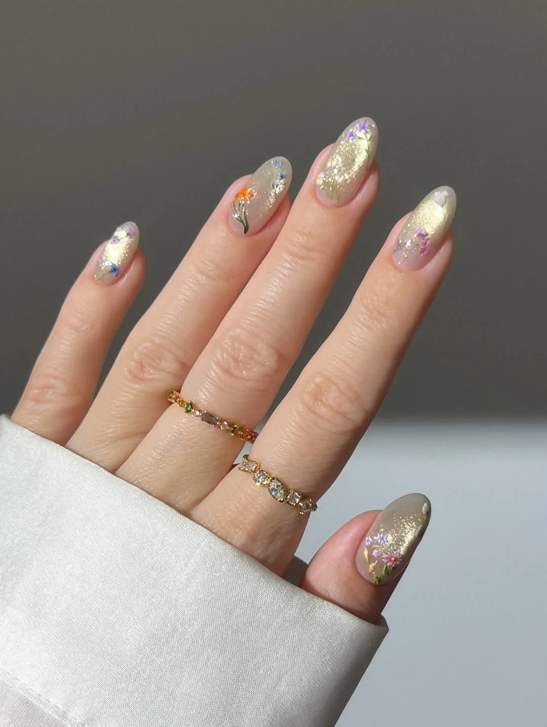 This romantic April design features an almond-shaped silhouette with a sheer nude base, elevated by a bold wash of iridescent gold shimmer and accented by delicate, hand-painted wildflowers for a sophisticated garden-inspired finish.