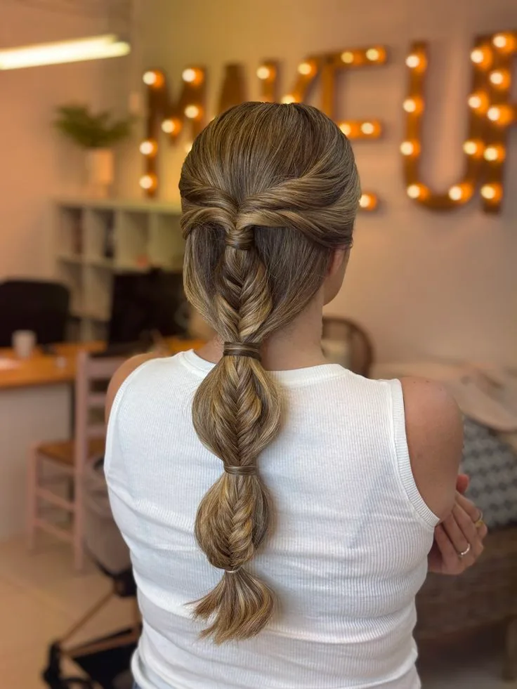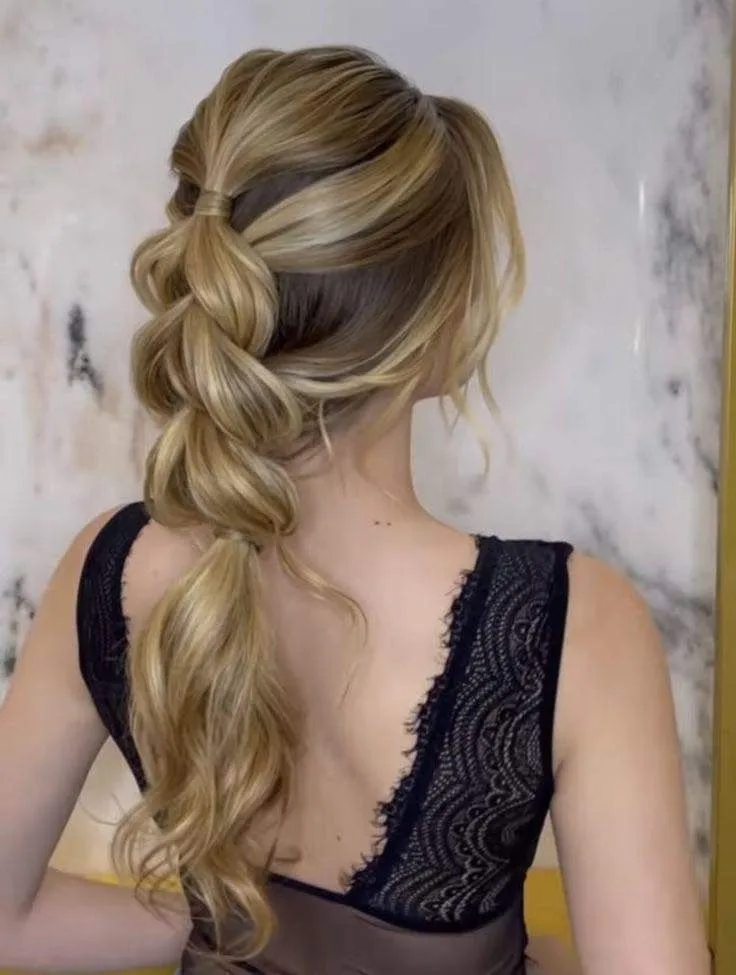 Elevate your formal look with this masterfully crafted Braided Prom Hairstyle, which combines the intricate detail of a fishtail weave with the playful volume of a bubble ponytail. This festive and polished style is the ultimate Pinterest-worthy inspiration for a sophisticated yet trendy appearance that’s perfect for any fashion or beauty blog.