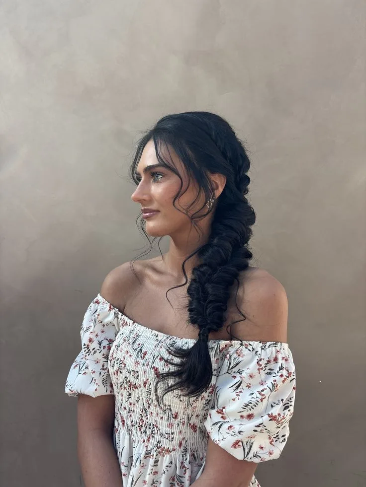 Capture a perfect blend of bohemian charm and modern elegance with this lush, voluminous side-braid, an iconic choice for a Braided Prom Hairstyle. This festive, Pinterest-ready look is beautifully accented with soft, face-framing tendrils, making it a dreamy and sophisticated centerpiece for any fashion or beauty blog.