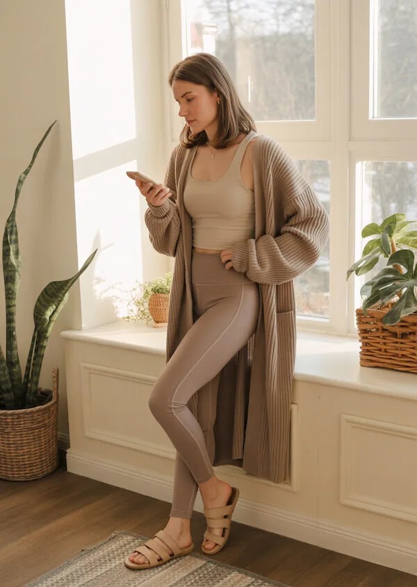 Taupe Leggings With Cream Tank And Knit Cardigan