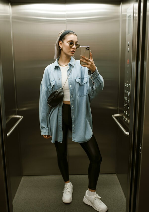 For an effortlessly chic summer look, pair sleek black leggings with an oversized denim shirt layered over a crisp white tee. This combo strikes the perfect balance between relaxed and polished—ideal for running errands or weekend brunches. Roll up the shirt sleeves for a casual vibe, and finish with white sneakers or slide sandals. The monochrome base lets the denim pop, while the breathable fabrics keep you cool. Accessorize with minimalist gold jewelry and a crossbody bag for a pulled-together touch.