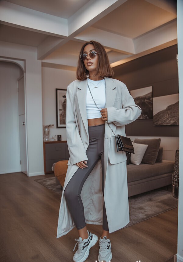 High Waisted Dark Leggings With Gray Long Blazer And Chunky Sneakers