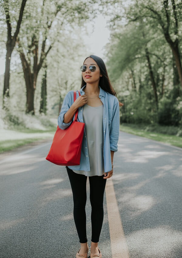 Black Leggings With Loose Chambray Shirt And Red Tote Bag