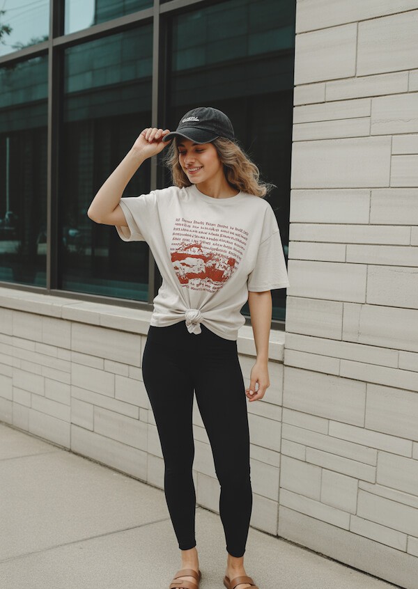 For a laid-back yet stylish summer look, pair classic black leggings with a crisp white graphic tee—think playful slogans or retro prints. Top it off with a sporty baseball cap for instant cool-girl vibes. This effortless combo is perfect for running errands, weekend brunches, or casual outings. Add white sneakers and oversized sunglasses to elevate the outfit. Breathable fabrics keep you comfy in the heat while looking put-together. Minimal effort, maximum impact!