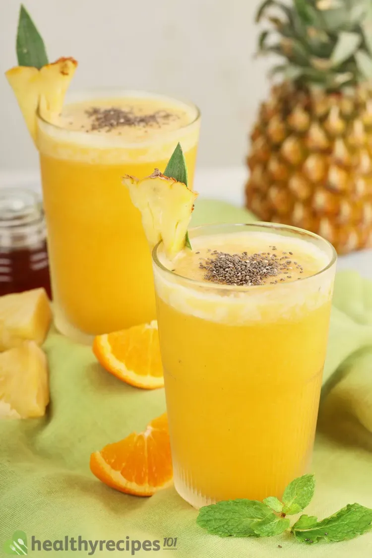 Fresh mint leaves — a small handful, maybe 8–10 leaves. Adds a cooling, fresh quality to the smoothie that pairs beautifully with the ginger and pineapple. Don’t skip this — it makes the smoothie taste genuinely refreshing instead of just fruity.