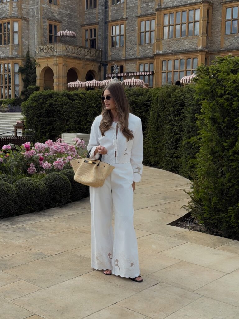 An all-white coordinated set instantly screams quiet luxury. The loose fit, breathable fabric, and clean tailoring make this ideal for warm-weather outings where you want to look polished without trying too hard. Paired with a woven tote, this outfit feels like something you’d wear at a resort or a summer brunch in Europe.