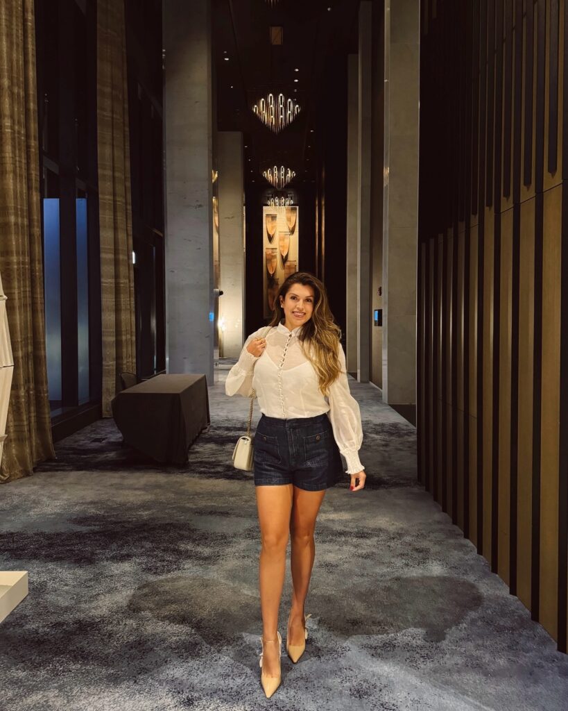 A crisp white blouse tucked into tailored dark shorts creates a polished yet playful evening outfit. It’s the perfect balance between formal and relaxed, making it ideal for dinners, events, or even date nights. Heels instantly elevate the look while keeping it modern.
