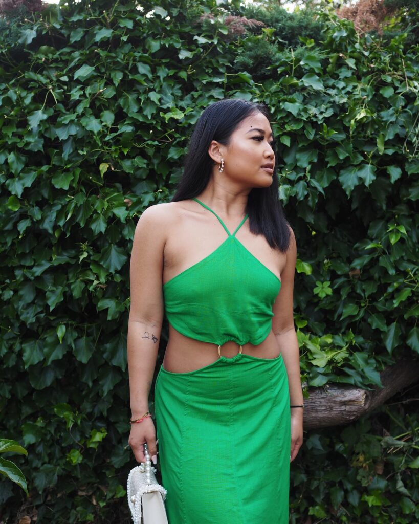 This vibrant green dress is all about making an entrance. The cut-out detailing adds a playful edge while still maintaining elegance through its clean lines. Ideal for summer parties, vacations, or statement evening looks, this outfit proves that color can do all the talking when styled right.