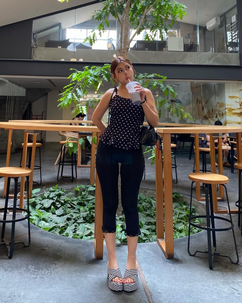 A fitted polka dot camisole paired with cropped leggings creates a fun, retro-inspired outfit. It’s youthful, slightly edgy, and perfect for casual outings or quick city errands. Chunky footwear or statement accessories can instantly elevate this look into a bold street-style moment.