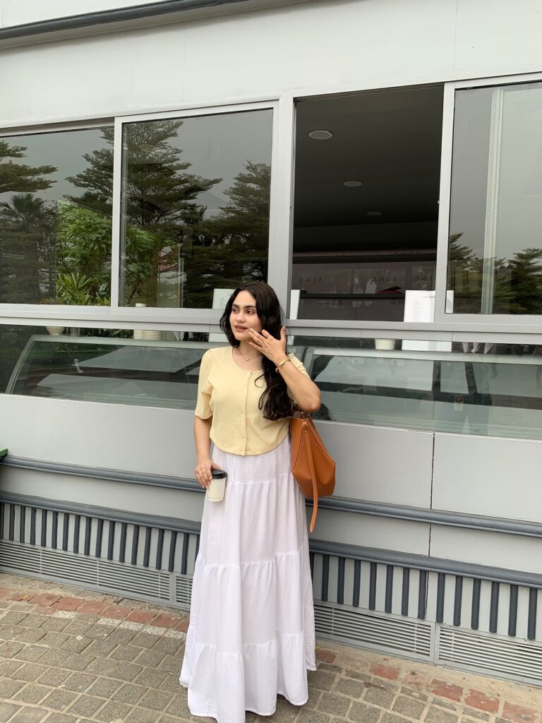 A lightweight blouse paired with a flowy white skirt gives major European summer energy. Feminine, airy, and effortless, this outfit is perfect for slow mornings at a café or strolling through aesthetic streets. The key here is in the details—delicate accessories and neutral tones keep it soft and elegant.