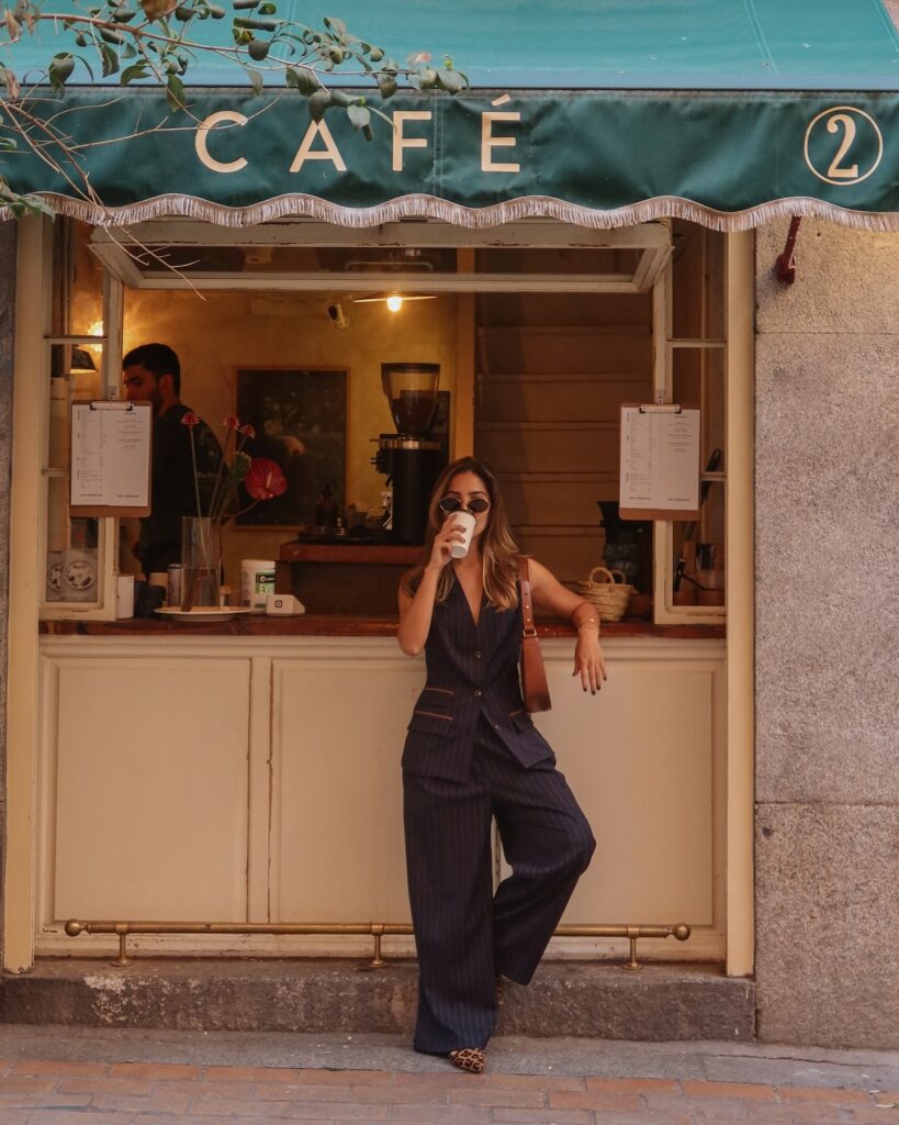 This tailored pinstripe co-ord blends masculine structure with feminine confidence. The sleeveless vest and wide-leg trousers create a sharp, elongated silhouette that feels both vintage-inspired and modern. Styled with statement shoes or a bold bag, it’s ideal for city strolls, café moments, or even creative workspaces.