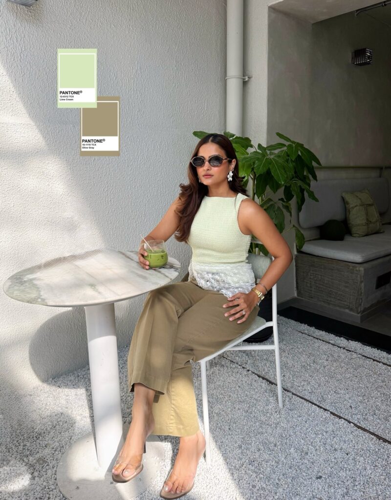 Muted greens and warm neutrals create a grounded, aesthetic look that feels calm and put-together. The fitted top with tailored pants adds structure, while the soft color palette keeps it relaxed and wearable. This is perfect for café hopping or casual meetings where you want to look stylish but approachable.