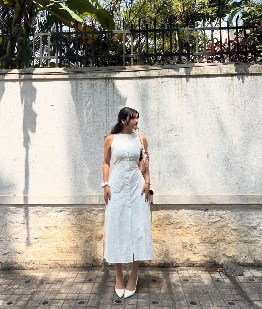 A sleeveless white linen dress that embodies simplicity and comfort. The breathable fabric and clean silhouette make it perfect for warm days, whether you’re out for a walk or heading to a casual brunch. Paired with classic heels or flats, this look is timeless and effortlessly graceful.