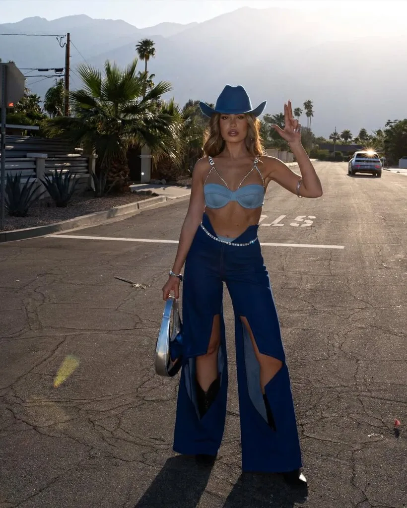 Turn heads at any concert with this edgy denim look featuring a chic bralette top, statement cut-out jeans, and a cowboy hat for that perfect mix of glam and western vibes. The silver accessories and boots add the ultimate festival-ready touch.