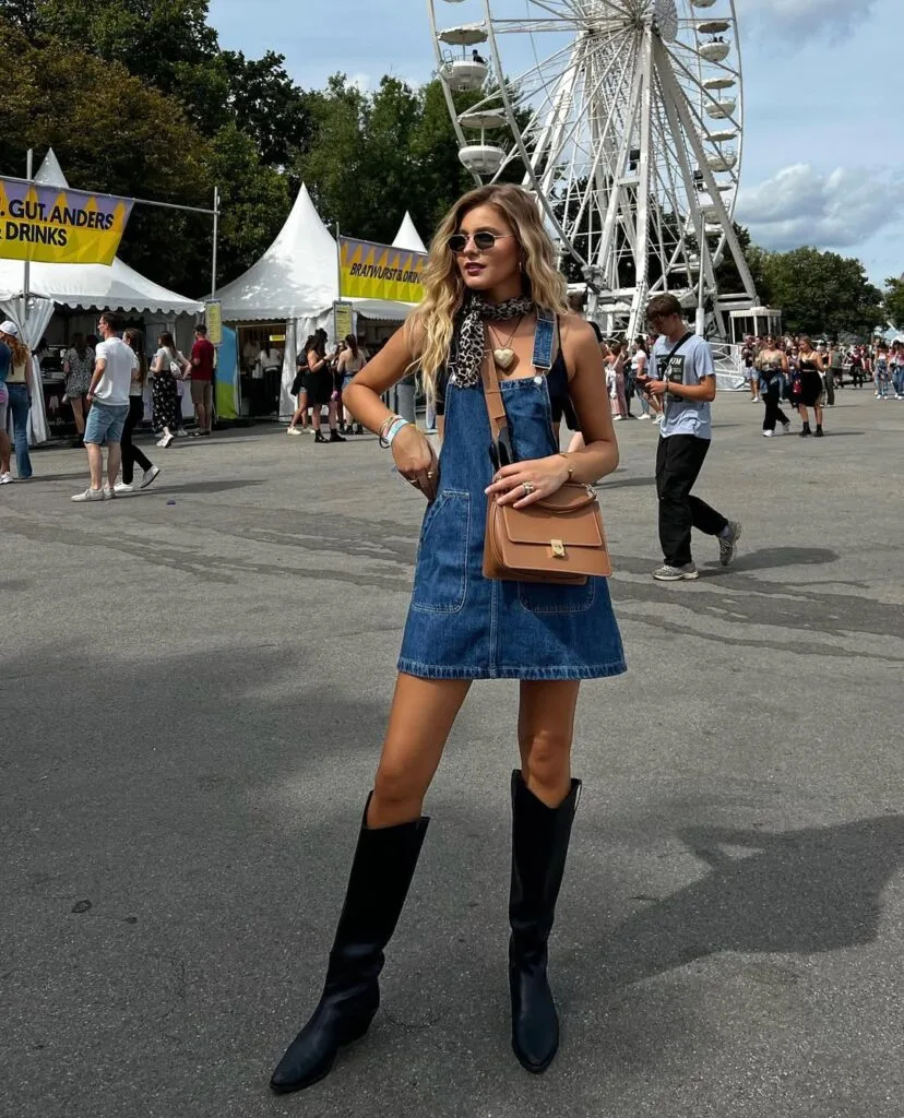 Keeping it classic with a twist—she’s got on a blue denim overall mini dress layered over a printed neck scarf, finished with black knee-high boots for the ultimate laid-back concert style.