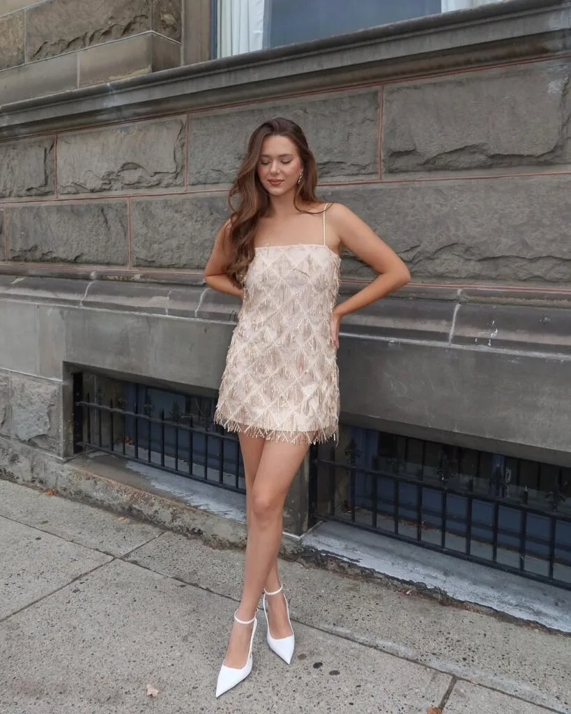 This look is pure glam! She’s rocking a champagne mini dress with sparkly feathered detailing and skinny straps—super chic and perfect for a concert or fancy night out.
