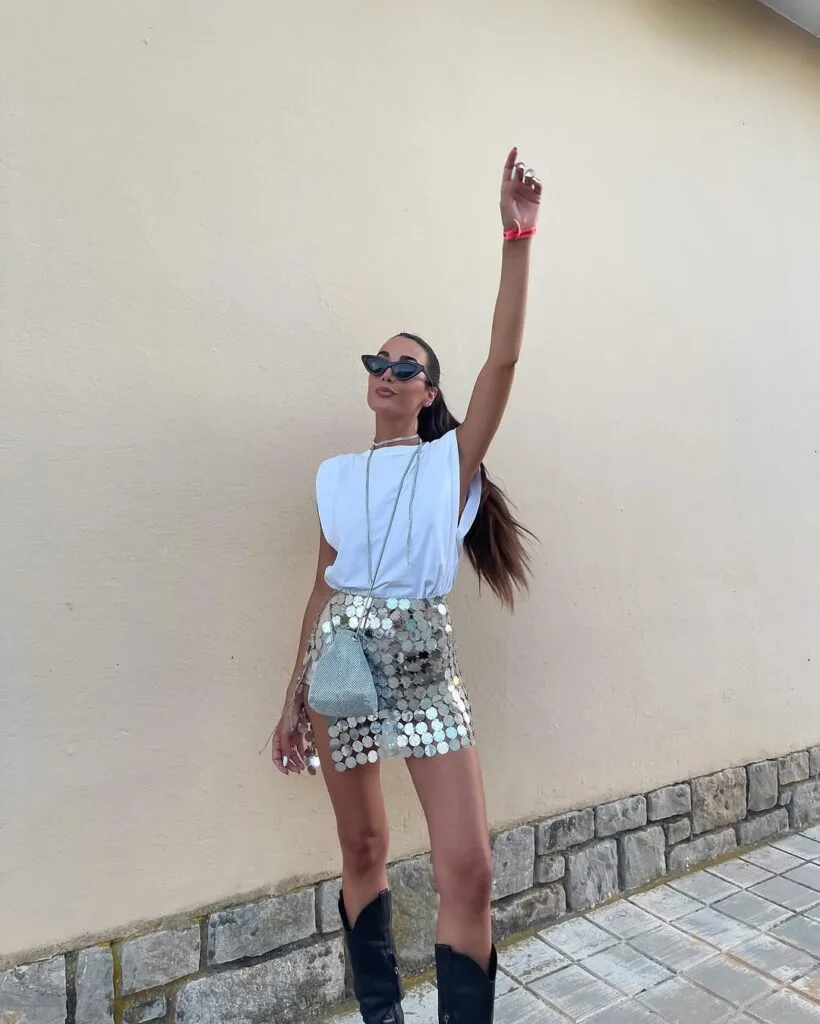 Obsessed with this cool combo—a crisp white padded-shoulder tee tucked into a statement silver sequin mini skirt, rocking it with black western boots for all the retro festival vibes.
