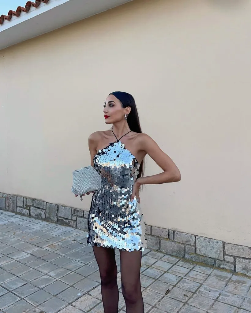 Serving up sparkle! She’s in a bold silver sequin mini dress that catches all the light, plus a pastel mini bag for a pop of color—this is the ultimate party-ready outfit for a night of live music.