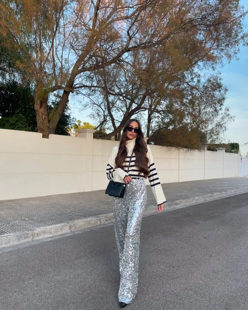 This look is street-chic perfection: a cozy cream and black striped sweater paired with statement silver sequin wide-leg pants—playful, comfy, and oh-so-cool for a concert night.