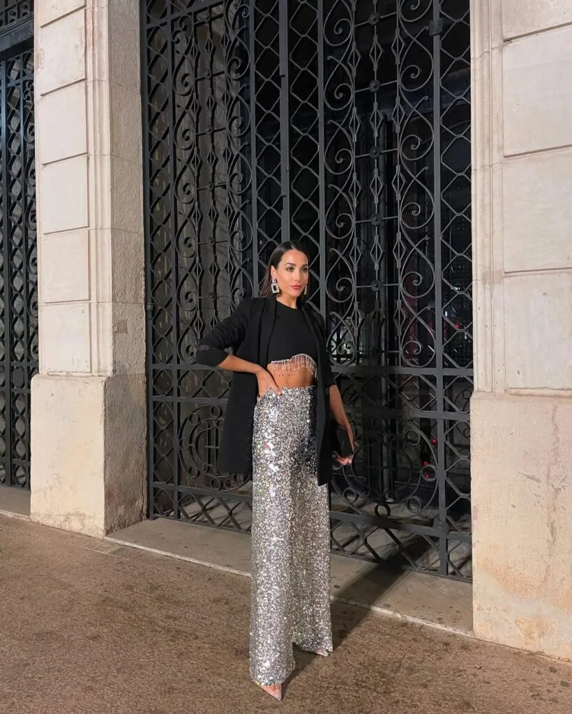 Major glam vibes here! She’s rocking silver sequin wide-leg pants with a black cropped top and a tailored black blazer—sleek and sparkly, ideal for dancing under the lights.