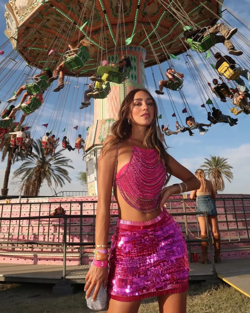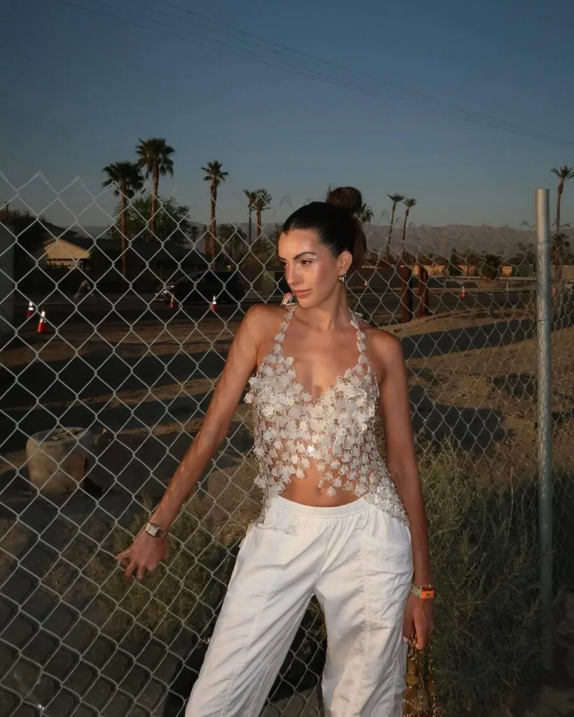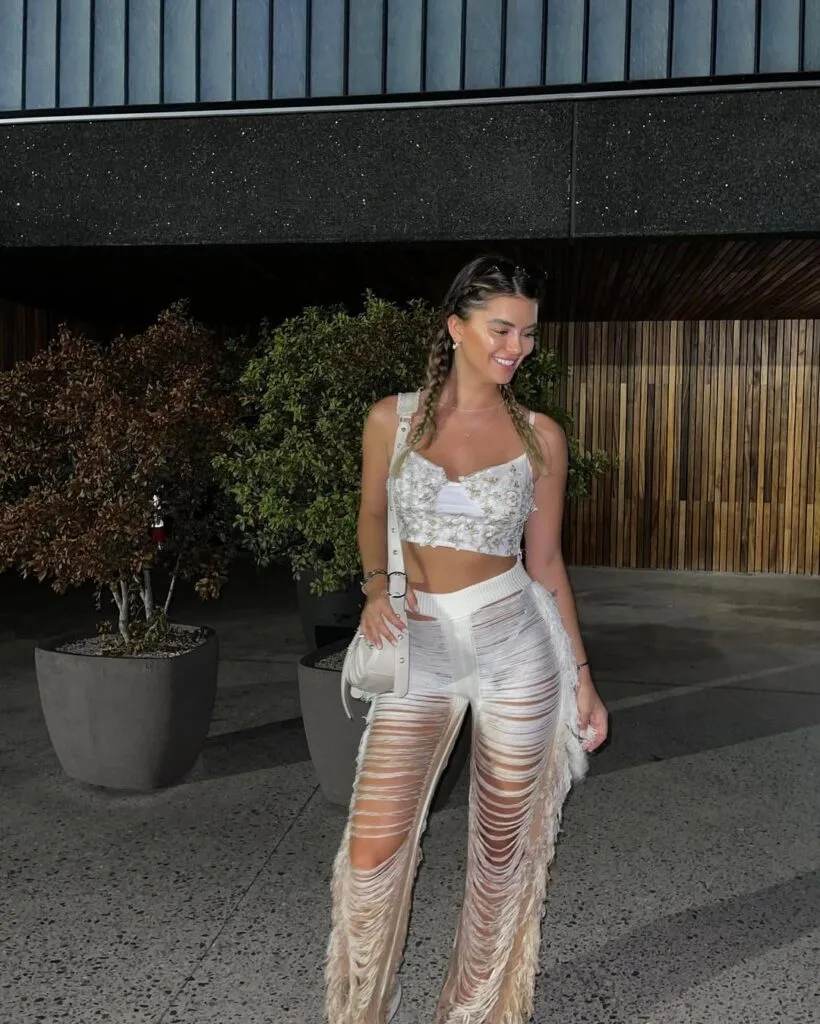 She serves major statement style in a white floral crop top and dramatic white pants with shredded fringe and sheer panels. It’s a playful, bold choice that totally nails the festival vibe.