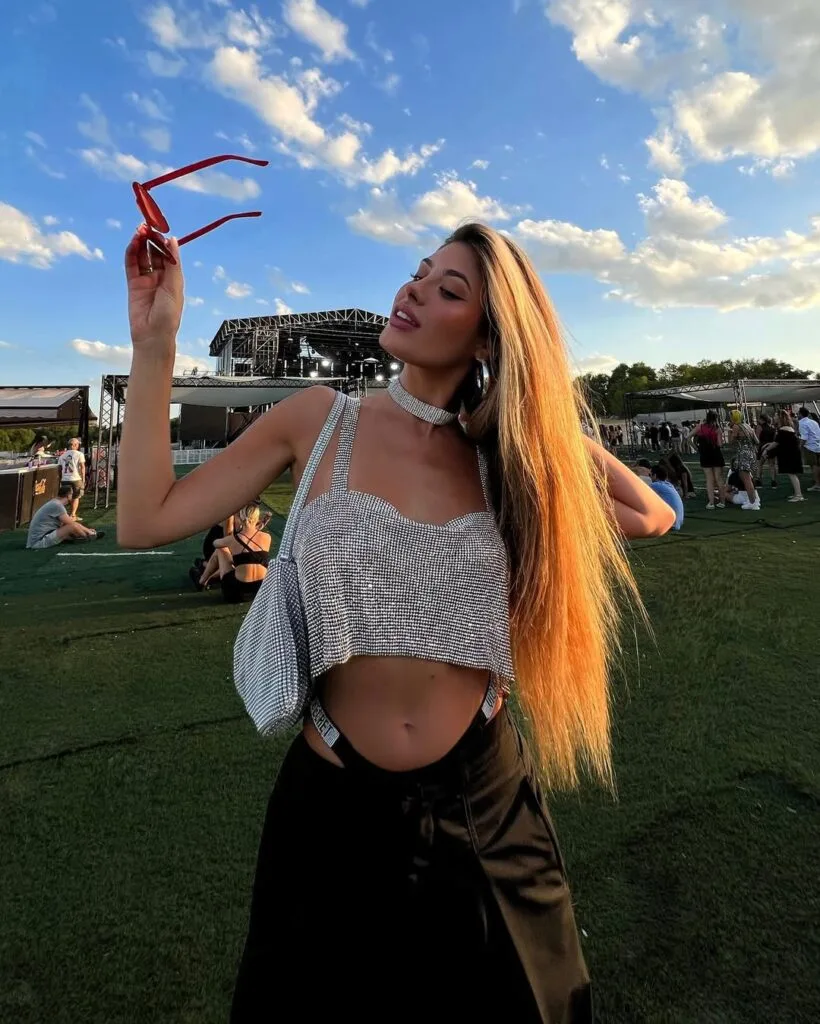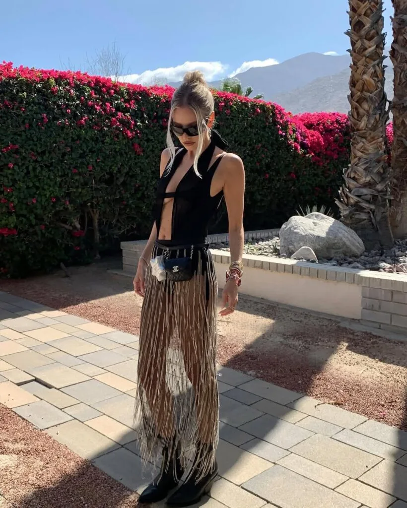 This outfit is festival magic—she’s in a daring black cut-out vest top paired with a long, sheer fringe skirt. Accessories like a belt bag and chunky bracelets add just the right edge for an outdoor concert.