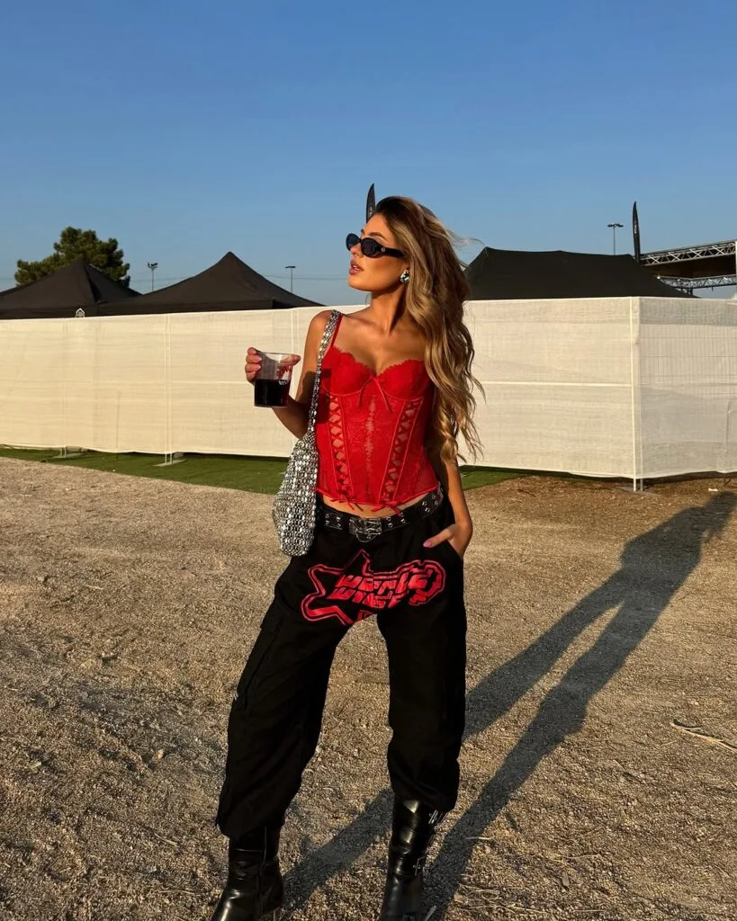 Obsessed with this edgy combo: a fire-engine red corset top paired with black graphic cargo pants. Add a studded belt and black chunky boots and you’re ready to take on any concert with serious style attitude!
