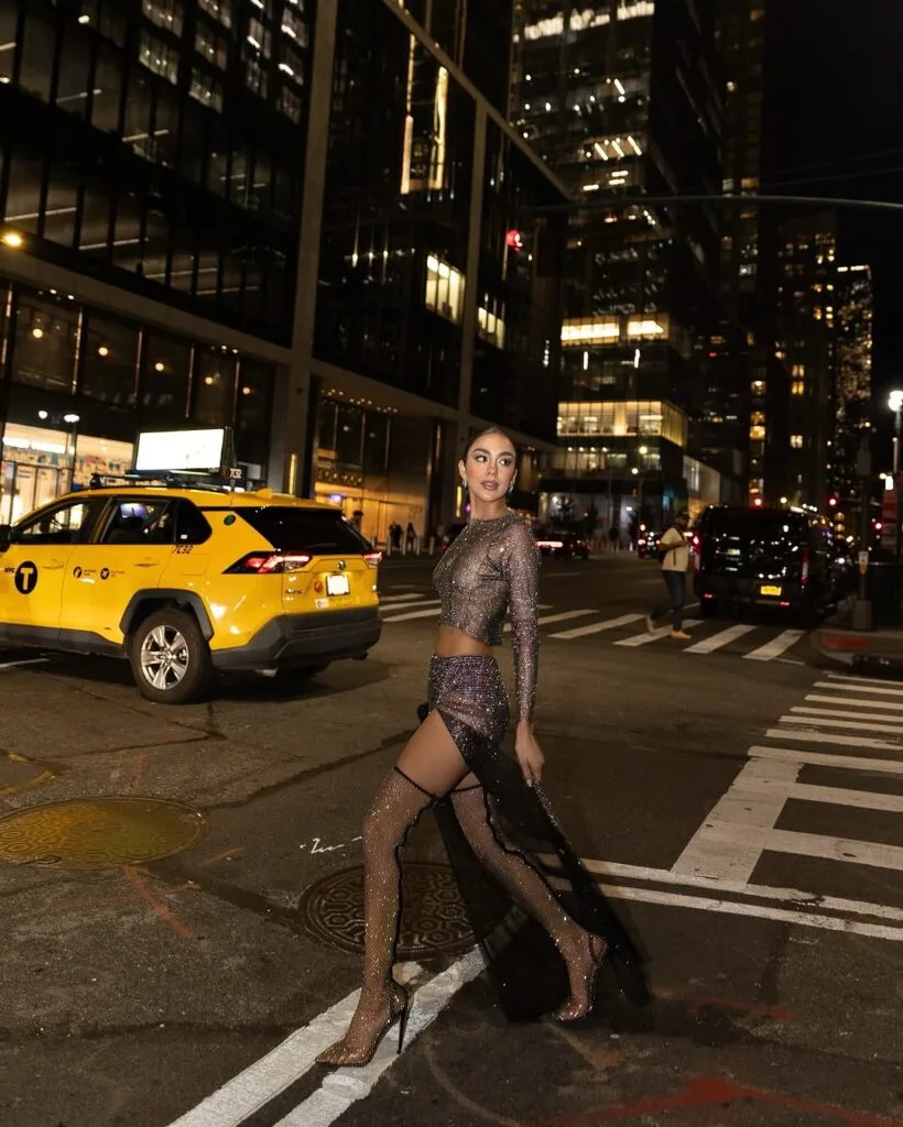 Own the night in this glittering sheer two-piece set featuring a high-slit skirt and sparkling long-sleeve crop top. Paired with sky-high heels, it’s a bold and glamorous look perfect for a city concert vibe.
