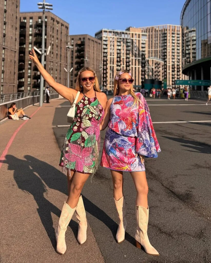 Loving these bold prints! One’s sporting a sequin floral halter mini while the other rocks a colorful, flowy long-sleeve dress—both styled with light Western boots, perfect for outdoor concerts.