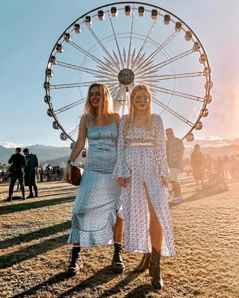Festival goals! These two are slaying in dreamy pastel maxi dresses—one in shimmering blue, the other in a breezy printed white—both finished off with combat boots for that effortless cool-girl vibe.
